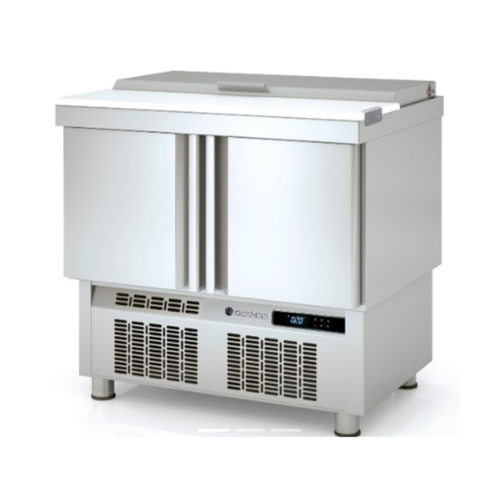 Coreco stainless steel AISI-304 18/10 saladette – pizza GN 1/1 refrigerated counter, 200 liters’ capacity, white polyethylene table, sliding to increase work surface, hinged lid, 40 kg in density, 0º+8º at 32º ambient temperature, 220V/50Hz/1Ph.