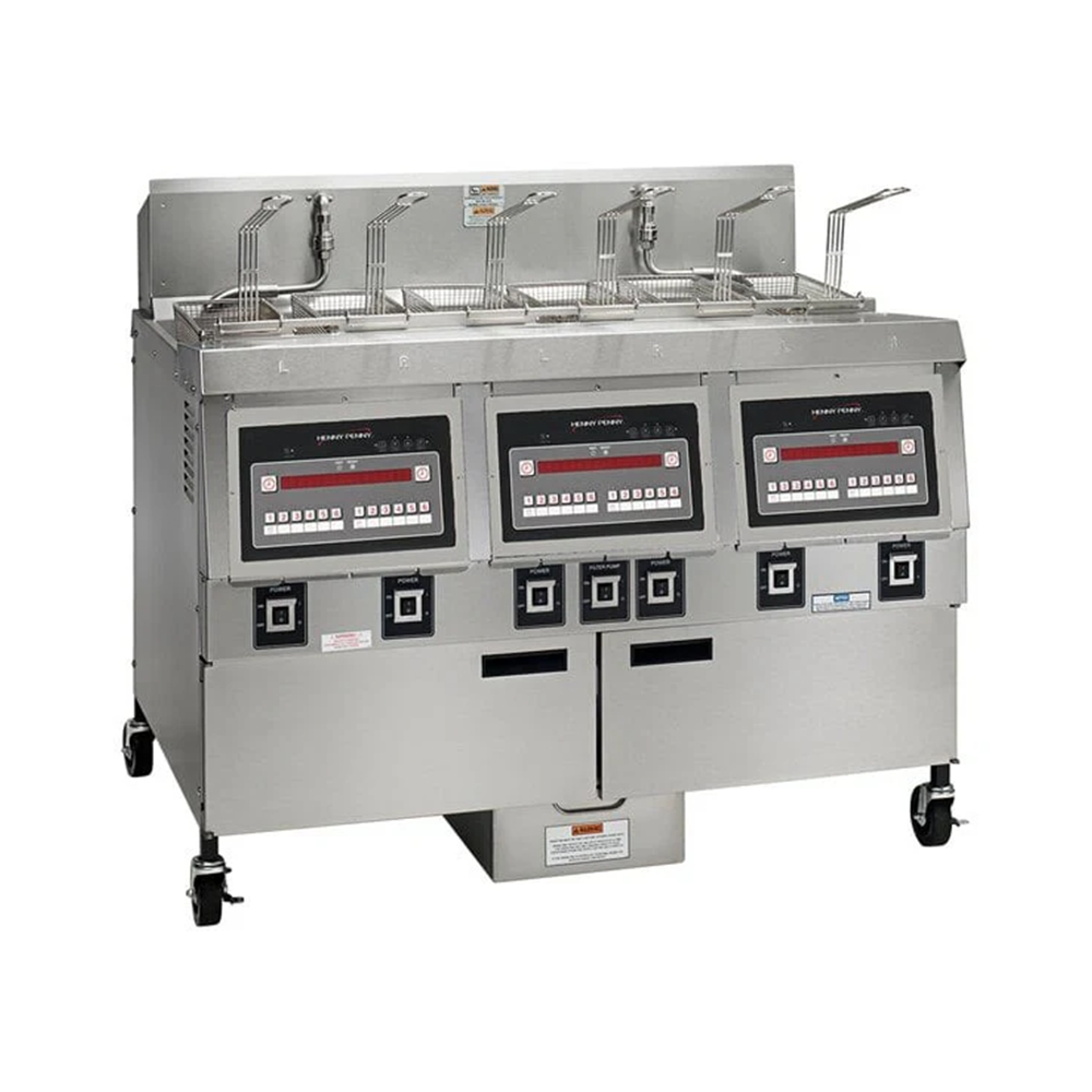 Henny Penny stainless steel electric operated open fryer with 3 wells and 3 basket support, 4 casters (2 locking) with computer controls, built-in filtration system, 20.4 Kg product and 88.5 Kg shortening capacity, 43.2 Kw, 380V/50Hz/3Ph, Dim: 1254 x 949 x 1118 mm (H)