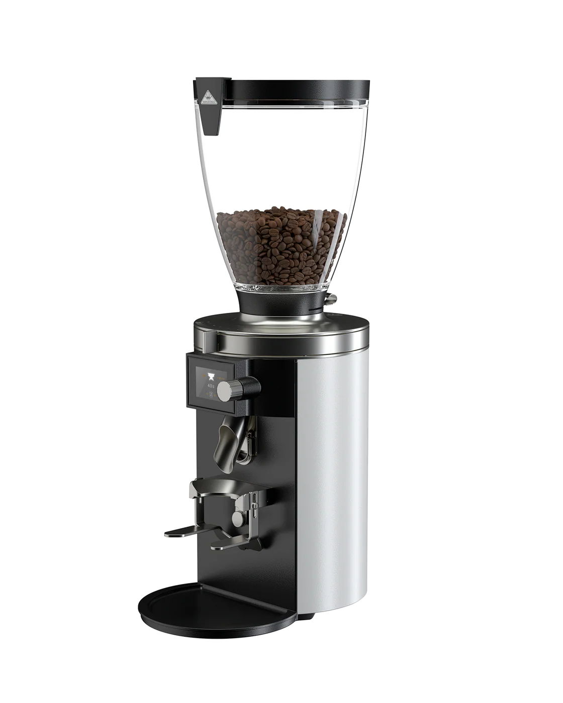 Next-generation espresso grinder with 65 mm flat burrs, available in black or white.