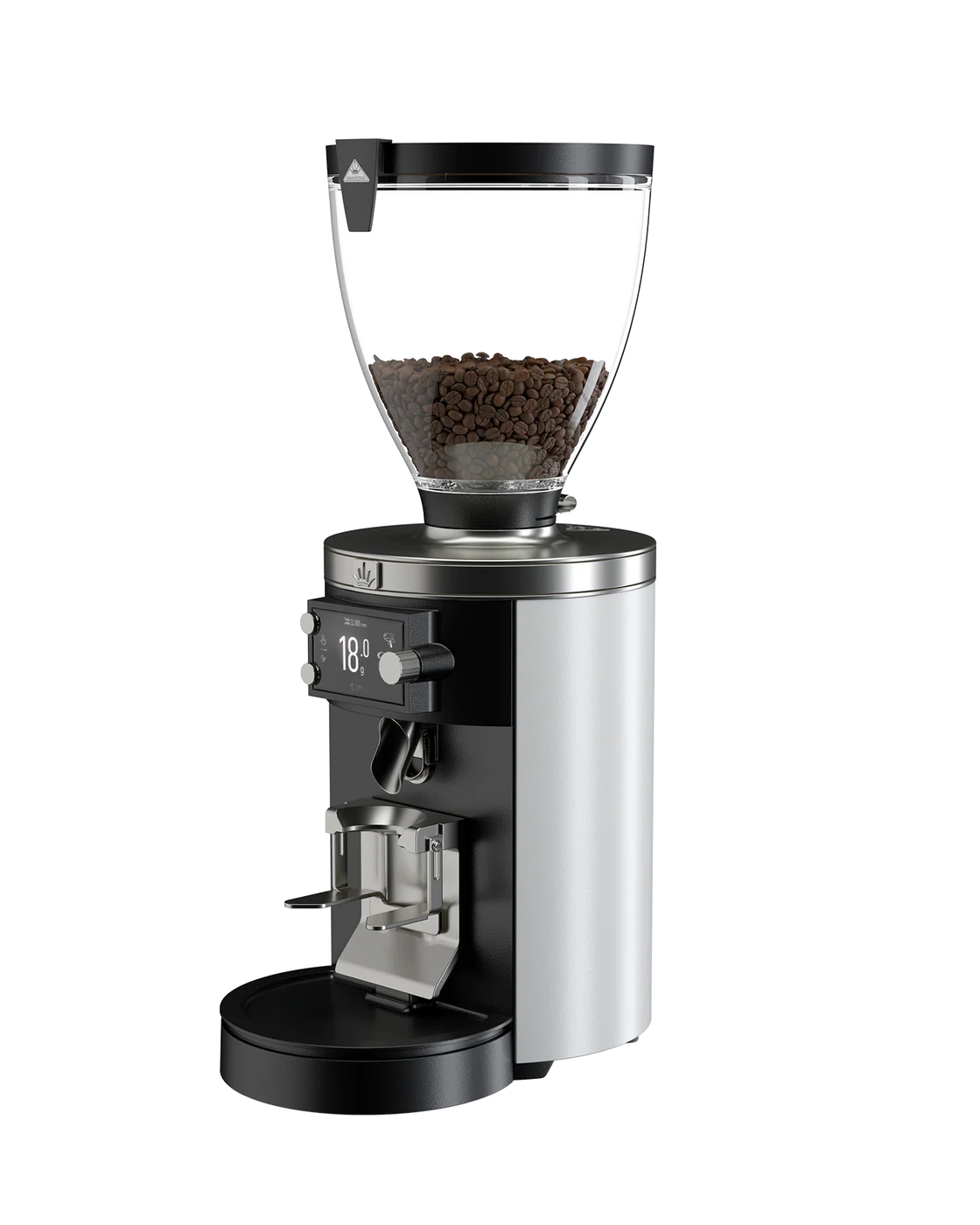 High-capacity espresso grinder with Grind-by-Sync connectivity and 80 mm burrs, available in black or white. (Grind-by-Sync)