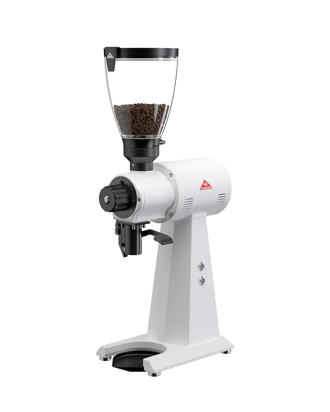All-round grinder with 98 mm burrs for espresso, filter, and Turkish coffee, available in black or white.