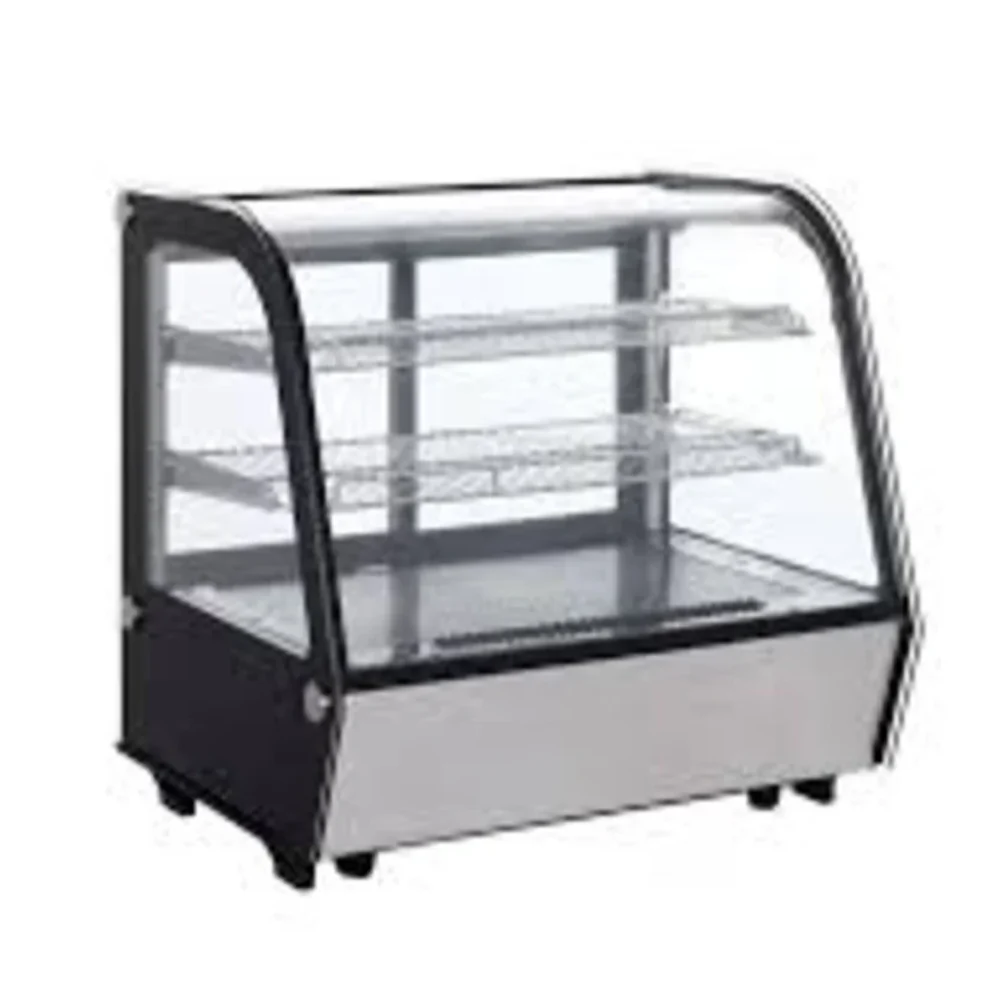 Stylish refrigerated countertop display case with curved glass and internal lighting – ideal for pastries, sandwiches, or beverages.